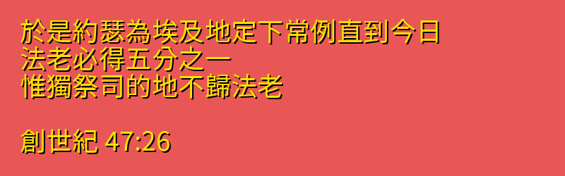 於是約瑟為埃及地定下常例直到今日、法老必得五分之一、惟獨祭司的地不歸法老。