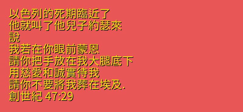 以色列的死期臨近了、他就叫了他兒子約瑟來、說、我若在你眼前蒙恩、請你把手放在我大腿底下、用慈愛和誠實待我、請你不要將我葬在埃及.