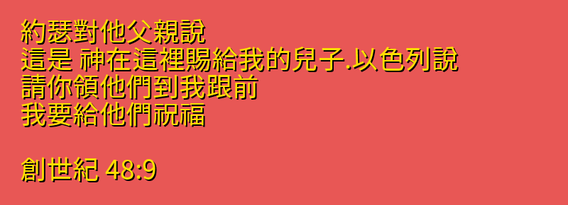 約瑟對他父親說、這是 神在這裡賜給我的兒子.以色列說、請你領他們到我跟前、我要給他們祝福。
