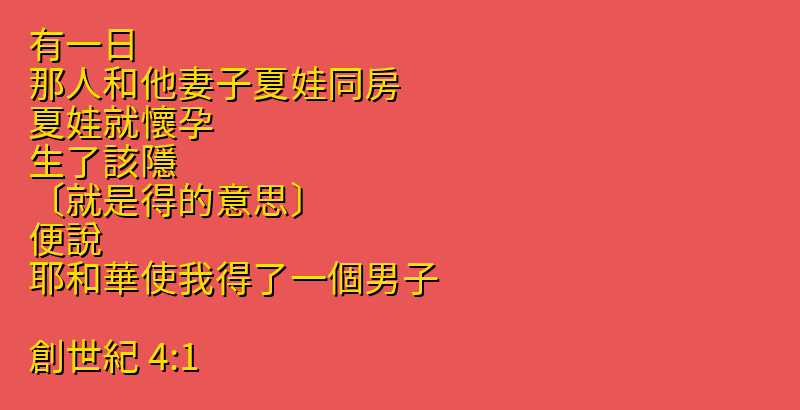 - 4:1 有一日、那人和他妻子夏娃同房、夏娃就懷孕、生了該隱、〔就是得的意思〕便說、耶和華使我得了一個男子。