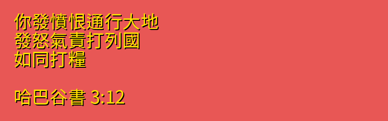 今日分享的中文聖經:「你發憤恨通行大地、發怒氣責打列國、如同打糧。」來自聖經「哈巴谷書」第「3章12節」,你可以繼續向下拉看到聖經卷書完整章節。每日中文聖經從神的話語中聆聽神的聲音,引導我們的人生,指導我們人生的方向,讓我們做出正確的選擇,而做出這些正確選擇的原則都在聖經中,所以我們需要讀神的話語,認識他的話語,把神的話語藏在心裡。