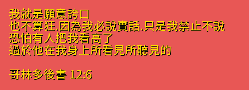 今日分享的中文聖經:「我就是願意誇口、也不算狂.因為我必說實話.只是我禁止不說、恐怕有人把我看高了、過於他在我身上所看見所聽見的。」來自聖經「哥林多後書」第「12章6節」,你可以繼續向下拉看到聖經卷書完整章節。每日中文聖經從神的話語中聆聽神的聲音,引導我們的人生,指導我們人生的方向,讓我們做出正確的選擇,而做出這些正確選擇的原則都在聖經中,所以我們需要讀神的話語,認識他的話語,把神的話語藏在心裡。