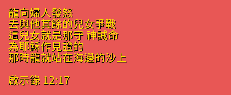 您對於啟示錄聖經「龍向婦人發怒、去與他其餘的兒女爭戰、這兒女就是那守 神誡命、為耶穌作見證的。那時龍就站在海邊的沙上。」有何comment?