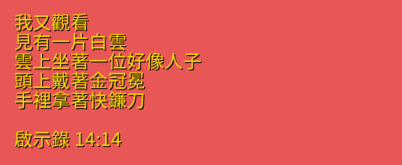 我又觀看、見有一片白雲、雲上坐著一位好像人子、頭上戴著金冠冕、手裡拿著快鐮刀。