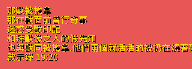 那獸被擒拿、那在獸面前曾行奇事、迷惑受獸印記、和拜獸像之人的假先知、也與獸同被擒拿.他們兩個就活活的被扔在燒著硫磺的火湖裡.