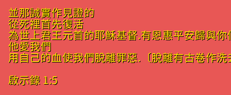 並那誠實作見證的、從死裡首先復活、為世上君王元首的耶穌基督.有恩惠平安歸與你們。他愛我們、用自己的血使我們脫離罪惡.〔脫離有古卷作洗去〕