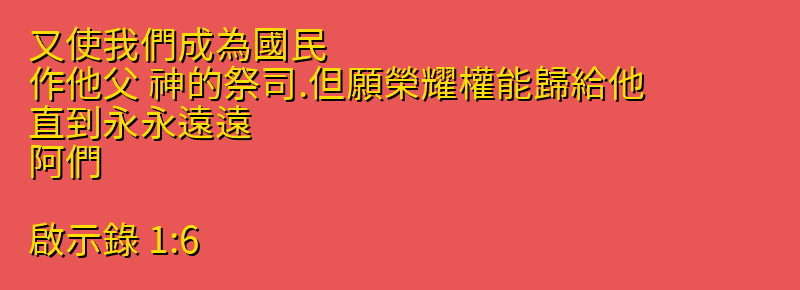 又使我們成為國民、作他父 神的祭司.但願榮耀權能歸給他、直到永永遠遠。阿們。