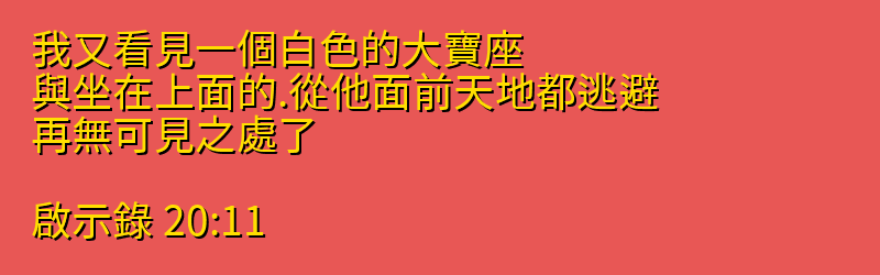 • 20:11 我又看見一個白色的大寶座、與坐在上面的.從他面前天地都逃避、再無可見之處了。