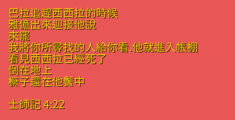 巴拉追趕西西拉的時候、雅億出來迎接他說、來罷、我將你所尋找的人給你看.他就進入帳棚、看見西西拉已經死了、倒在地上、橛子還在他鬢中。