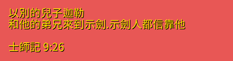 今日分享的中文聖經:「以別的兒子迦勒、和他的弟兄來到示劍.示劍人都信靠他。」來自聖經「士師記」第「9章26節」,你可以繼續向下拉看到聖經卷書完整章節。每日中文聖經從神的話語中聆聽神的聲音,引導我們的人生,指導我們人生的方向,讓我們做出正確的選擇,而做出這些正確選擇的原則都在聖經中,所以我們需要讀神的話語,認識他的話語,把神的話語藏在心裡。