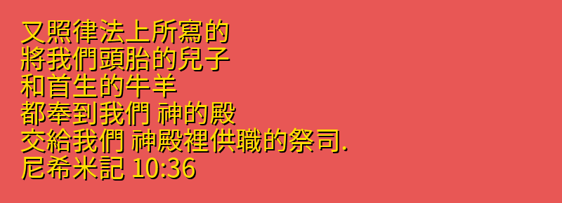 又照律法上所寫的、將我們頭胎的兒子、和首生的牛羊、都奉到我們 神的殿、交給我們 神殿裡供職的祭司.