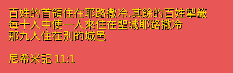 - 11:1 百姓的首領住在耶路撒冷.其餘的百姓掣籤、每十人中使一人來住在聖城耶路撒冷、那九人住在別的城邑。