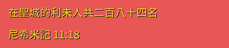 今日分享的中文聖經:「在聖城的利未人共二百八十四名。」來自聖經「尼希米記」第「11章18節」,你可以繼續向下拉看到聖經卷書完整章節。每日中文聖經從神的話語中聆聽神的聲音,引導我們的人生,指導我們人生的方向,讓我們做出正確的選擇,而做出這些正確選擇的原則都在聖經中,所以我們需要讀神的話語,認識他的話語,把神的話語藏在心裡。