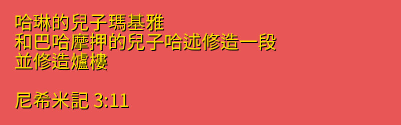 今日分享的中文聖經:「哈琳的兒子瑪基雅、和巴哈摩押的兒子哈述修造一段、並修造爐樓。」來自聖經「尼希米記」第「3章11節」,你可以繼續向下拉看到聖經卷書完整章節。每日中文聖經從神的話語中聆聽神的聲音,引導我們的人生,指導我們人生的方向,讓我們做出正確的選擇,而做出這些正確選擇的原則都在聖經中,所以我們需要讀神的話語,認識他的話語,把神的話語藏在心裡。