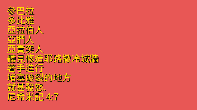 參巴拉、多比雅、亞拉伯人、亞捫人、亞實突人、聽見修造耶路撒冷城牆、著手進行、堵塞破裂的地方、就甚發怒.