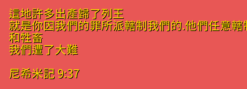 今日分享的中文聖經:「這地許多出產歸了列王、就是你因我們的罪所派轄制我們的.他們任意轄制我們的身體、和牲畜、我們遭了大難。」來自聖經「尼希米記」第「9章37節」,你可以繼續向下拉看到聖經卷書完整章節。每日中文聖經從神的話語中聆聽神的聲音,引導我們的人生,指導我們人生的方向,讓我們做出正確的選擇,而做出這些正確選擇的原則都在聖經中,所以我們需要讀神的話語,認識他的話語,把神的話語藏在心裡。