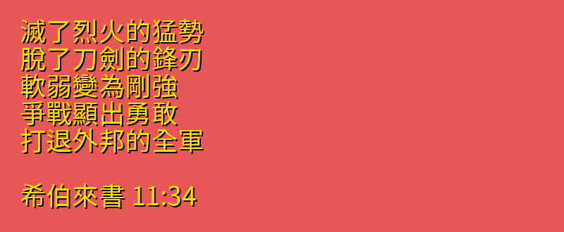 滅了烈火的猛勢、脫了刀劍的鋒刃、軟弱變為剛強、爭戰顯出勇敢、打退外邦的全軍。