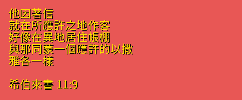 他因著信、就在所應許之地作客、好像在異地居住帳棚、與那同蒙一個應許的以撒、雅各一樣。
