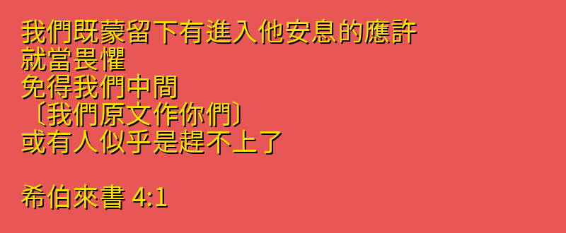 - 4:1 我們既蒙留下有進入他安息的應許、就當畏懼、免得我們中間、〔我們原文作你們〕或有人似乎是趕不上了。