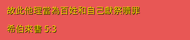 今日分享的中文聖經:「故此他理當為百姓和自己獻祭贖罪。」來自聖經「希伯來書」第「5章3節」,你可以繼續向下拉看到聖經卷書完整章節。每日中文聖經從神的話語中聆聽神的聲音,引導我們的人生,指導我們人生的方向,讓我們做出正確的選擇,而做出這些正確選擇的原則都在聖經中,所以我們需要讀神的話語,認識他的話語,把神的話語藏在心裡。