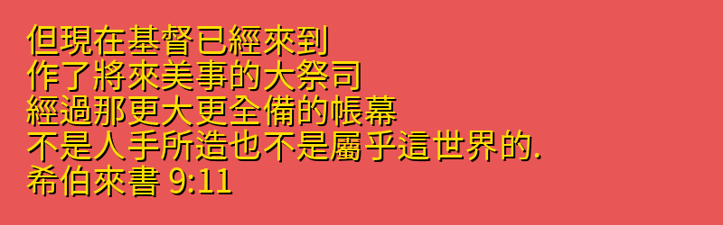 但現在基督已經來到、作了將來美事的大祭司、經過那更大更全備的帳幕、不是人手所造也不是屬乎這世界的.