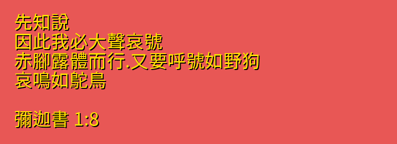 先知說、因此我必大聲哀號、赤腳露體而行.又要呼號如野狗、哀鳴如鴕鳥。