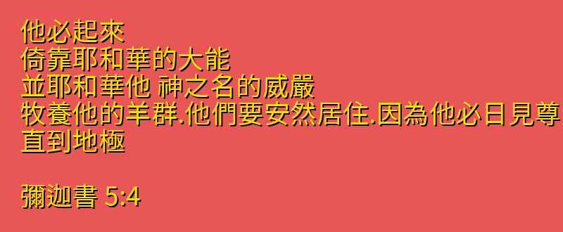 今日分享的中文聖經:「他必起來、倚靠耶和華的大能、並耶和華他 神之名的威嚴、牧養他的羊群.他們要安然居住.因為他必日見尊大、直到地極。」來自聖經「彌迦書」第「5章4節」,你可以繼續向下拉看到聖經卷書完整章節。每日中文聖經從神的話語中聆聽神的聲音,引導我們的人生,指導我們人生的方向,讓我們做出正確的選擇,而做出這些正確選擇的原則都在聖經中,所以我們需要讀神的話語,認識他的話語,把神的話語藏在心裡。