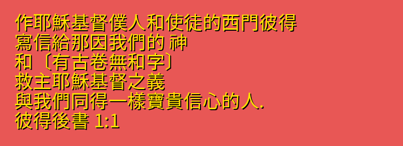 - 1:1 作耶穌基督僕人和使徒的西門彼得、寫信給那因我們的 神、和〔有古卷無和字〕救主耶穌基督之義、與我們同得一樣寶貴信心的人.