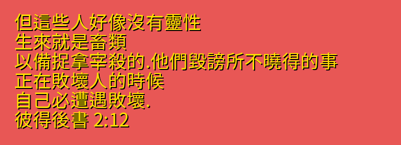 但這些人好像沒有靈性、生來就是畜類、以備捉拿宰殺的.他們毀謗所不曉得的事、正在敗壞人的時候、自己必遭遇敗壞.