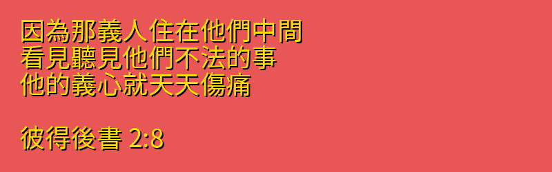 • 2:8 因為那義人住在他們中間、看見聽見他們不法的事、他的義心就天天傷痛。