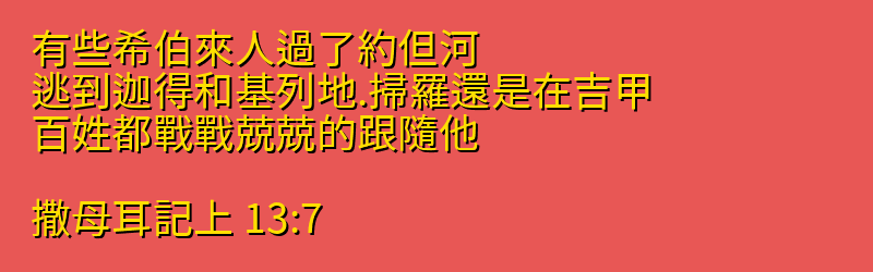今日分享的中文聖經:「有些希伯來人過了約但河、逃到迦得和基列地.掃羅還是在吉甲、百姓都戰戰兢兢的跟隨他。」來自聖經「撒母耳記上」第「13章7節」,你可以繼續向下拉看到聖經卷書完整章節。每日中文聖經從神的話語中聆聽神的聲音,引導我們的人生,指導我們人生的方向,讓我們做出正確的選擇,而做出這些正確選擇的原則都在聖經中,所以我們需要讀神的話語,認識他的話語,把神的話語藏在心裡。