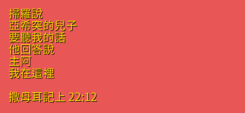 今日分享的中文聖經:「掃羅說、亞希突的兒子、要聽我的話。他回答說、主阿、我在這裡。」來自聖經「撒母耳記上」第「22章12節」,你可以繼續向下拉看到聖經卷書完整章節。每日中文聖經從神的話語中聆聽神的聲音,引導我們的人生,指導我們人生的方向,讓我們做出正確的選擇,而做出這些正確選擇的原則都在聖經中,所以我們需要讀神的話語,認識他的話語,把神的話語藏在心裡。