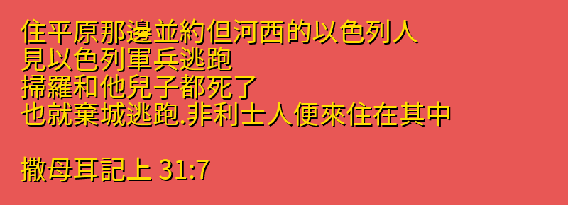 今日分享的中文聖經:「住平原那邊並約但河西的以色列人、見以色列軍兵逃跑、掃羅和他兒子都死了、也就棄城逃跑.非利士人便來住在其中。」來自聖經「撒母耳記上」第「31章7節」,你可以繼續向下拉看到聖經卷書完整章節。每日中文聖經從神的話語中聆聽神的聲音,引導我們的人生,指導我們人生的方向,讓我們做出正確的選擇,而做出這些正確選擇的原則都在聖經中,所以我們需要讀神的話語,認識他的話語,把神的話語藏在心裡。