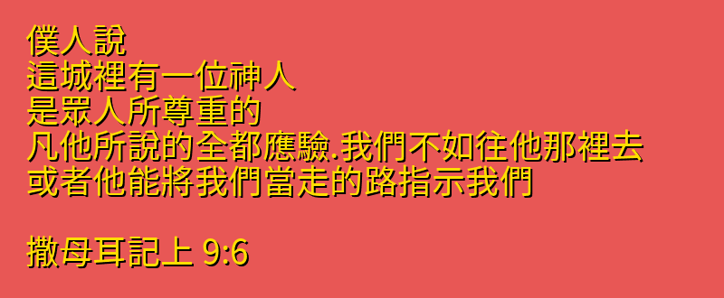 今日分享的中文聖經:「僕人說、這城裡有一位神人、是眾人所尊重的、凡他所說的全都應驗.我們不如往他那裡去、或者他能將我們當走的路指示我們。」來自聖經「撒母耳記上」第「9章6節」,你可以繼續向下拉看到聖經卷書完整章節。每日中文聖經從神的話語中聆聽神的聲音,引導我們的人生,指導我們人生的方向,讓我們做出正確的選擇,而做出這些正確選擇的原則都在聖經中,所以我們需要讀神的話語,認識他的話語,把神的話語藏在心裡。