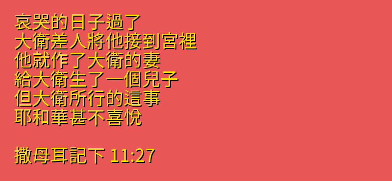 聖經哀哭的日子過了、大衛差人將他接到宮裡、他就作了大衛的妻、給大衛生了一個兒子。但大衛所行的這事、耶和華甚不喜悅。 2025年12月推介聖經優惠