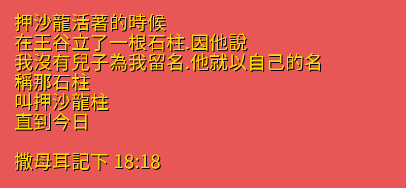 押沙龍活著的時候、在王谷立了一根石柱.因他說、我沒有兒子為我留名.他就以自己的名、稱那石柱、叫押沙龍柱、直到今日。