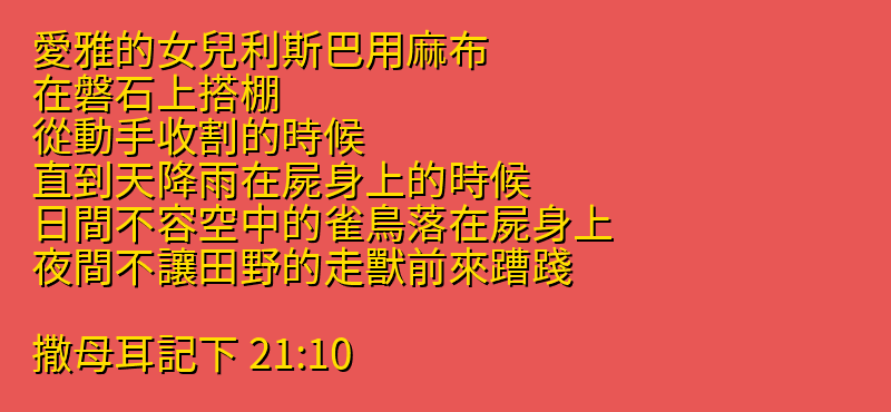 愛雅的女兒利斯巴用麻布、在磐石上搭棚、從動手收割的時候、直到天降雨在屍身上的時候、日間不容空中的雀鳥落在屍身上、夜間不讓田野的走獸前來蹧踐。