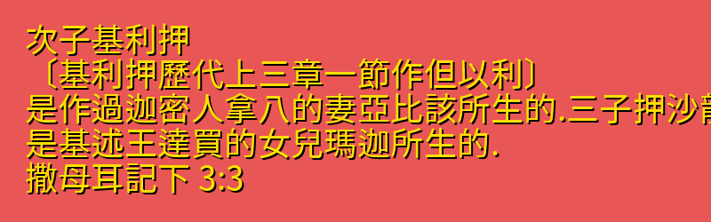 • 3:3 次子基利押、〔基利押歷代上三章一節作但以利〕是作過迦密人拿八的妻亞比該所生的.三子押沙龍、是基述王達買的女兒瑪迦所生的.