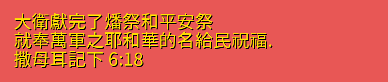 今日分享的中文聖經:「大衛獻完了燔祭和平安祭、就奉萬軍之耶和華的名給民祝福.」來自聖經「撒母耳記下」第「6章18節」,你可以繼續向下拉看到聖經卷書完整章節。每日中文聖經從神的話語中聆聽神的聲音,引導我們的人生,指導我們人生的方向,讓我們做出正確的選擇,而做出這些正確選擇的原則都在聖經中,所以我們需要讀神的話語,認識他的話語,把神的話語藏在心裡。