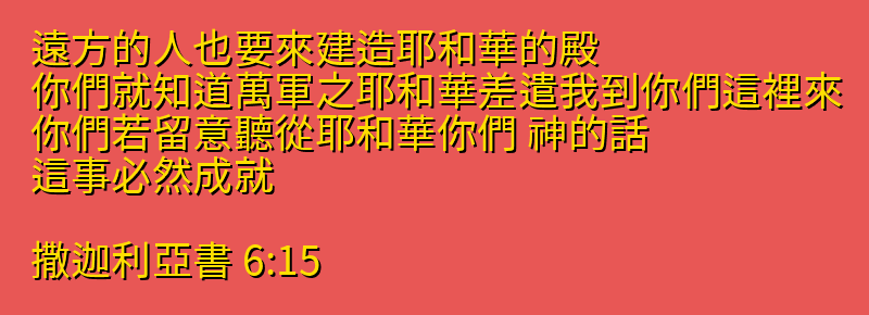 遠方的人也要來建造耶和華的殿。你們就知道萬軍之耶和華差遣我到你們這裡來。你們若留意聽從耶和華你們 神的話、這事必然成就。