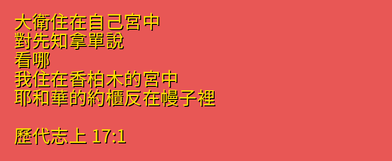 - 17:1 大衛住在自己宮中、對先知拿單說、看哪、我住在香柏木的宮中、耶和華的約櫃反在幔子裡。