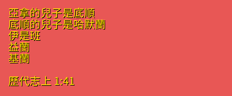 今日分享的中文聖經:「亞拿的兒子是底順。底順的兒子是哈默蘭、伊是班、益蘭、基蘭。」來自聖經「歷代志上」第「1章41節」,你可以繼續向下拉看到聖經卷書完整章節。每日中文聖經從神的話語中聆聽神的聲音,引導我們的人生,指導我們人生的方向,讓我們做出正確的選擇,而做出這些正確選擇的原則都在聖經中,所以我們需要讀神的話語,認識他的話語,把神的話語藏在心裡。