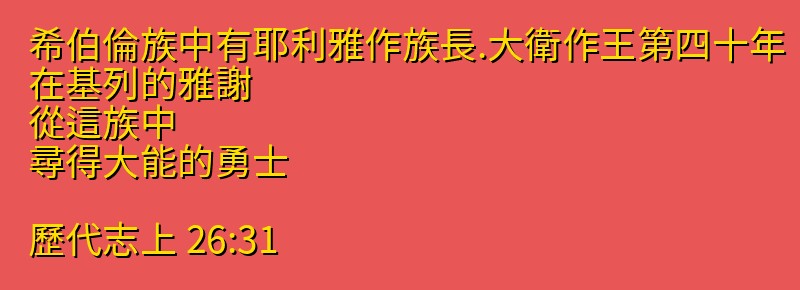 希伯倫族中有耶利雅作族長.大衛作王第四十年、在基列的雅謝、從這族中、尋得大能的勇士。