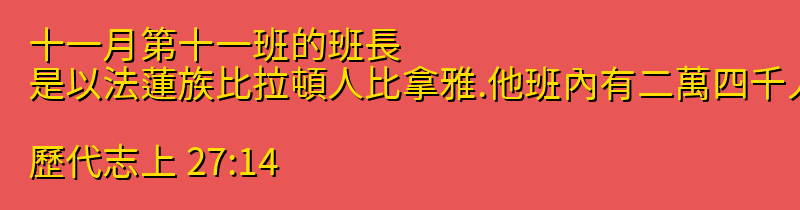 今日分享的中文聖經:「十一月第十一班的班長、是以法蓮族比拉頓人比拿雅.他班內有二萬四千人。」來自聖經「歷代志上」第「27章14節」,你可以繼續向下拉看到聖經卷書完整章節。每日中文聖經從神的話語中聆聽神的聲音,引導我們的人生,指導我們人生的方向,讓我們做出正確的選擇,而做出這些正確選擇的原則都在聖經中,所以我們需要讀神的話語,認識他的話語,把神的話語藏在心裡。