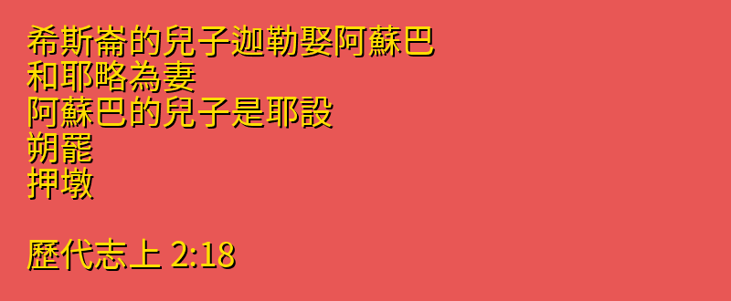 希斯崙的兒子迦勒娶阿蘇巴、和耶略為妻、阿蘇巴的兒子是耶設、朔罷、押墩。