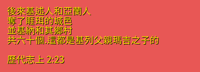 今日分享的中文聖經:「後來基述人和亞蘭人、奪了睚珥的城邑、並基納和其鄉村、共六十個.這都是基列父親瑪吉之子的。」來自聖經「歷代志上」第「2章23節」,你可以繼續向下拉看到聖經卷書完整章節。每日中文聖經從神的話語中聆聽神的聲音,引導我們的人生,指導我們人生的方向,讓我們做出正確的選擇,而做出這些正確選擇的原則都在聖經中,所以我們需要讀神的話語,認識他的話語,把神的話語藏在心裡。