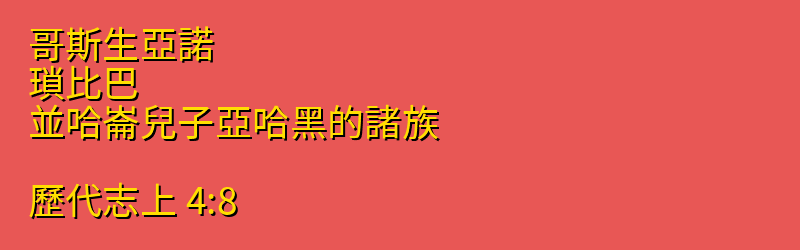今日分享的中文聖經:「哥斯生亞諾、瑣比巴、並哈崙兒子亞哈黑的諸族。」來自聖經「歷代志上」第「4章8節」,你可以繼續向下拉看到聖經卷書完整章節。每日中文聖經從神的話語中聆聽神的聲音,引導我們的人生,指導我們人生的方向,讓我們做出正確的選擇,而做出這些正確選擇的原則都在聖經中,所以我們需要讀神的話語,認識他的話語,把神的話語藏在心裡。