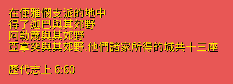 • 6:62 革順族、按著宗族、在以薩迦支派的地中、亞設支派的地中、拿弗他利支派的地中、巴珊內瑪拿西支派的地中、得了十三座城。