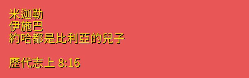今日分享的中文聖經:「米迦勒、伊施巴、約哈都是比利亞的兒子。」來自聖經「歷代志上」第「8章16節」,你可以繼續向下拉看到聖經卷書完整章節。每日中文聖經從神的話語中聆聽神的聲音,引導我們的人生,指導我們人生的方向,讓我們做出正確的選擇,而做出這些正確選擇的原則都在聖經中,所以我們需要讀神的話語,認識他的話語,把神的話語藏在心裡。