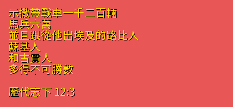 示撒帶戰車一千二百輛、馬兵六萬、並且跟從他出埃及的路比人、蘇基人、和古實人、多得不可勝數。